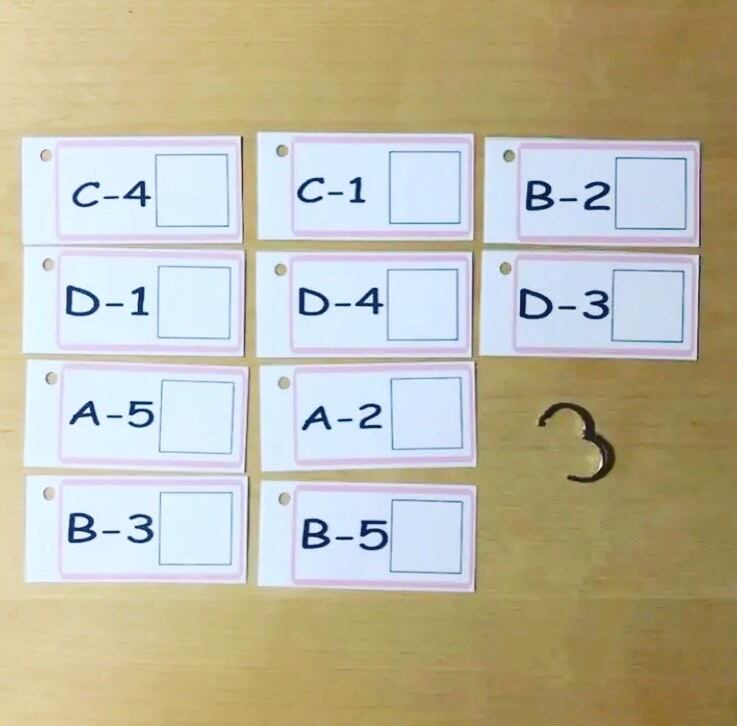 1.問題を解いて、問題の位置にあるキャラクターカードを選んで答えの部分に置いてもらいます。